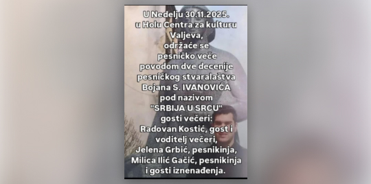 Pesničko veče "Srbija u srcu"   U nedelju, 30. novembra u 18.00 č Hol centra za kulturu Valjevo
